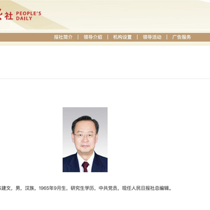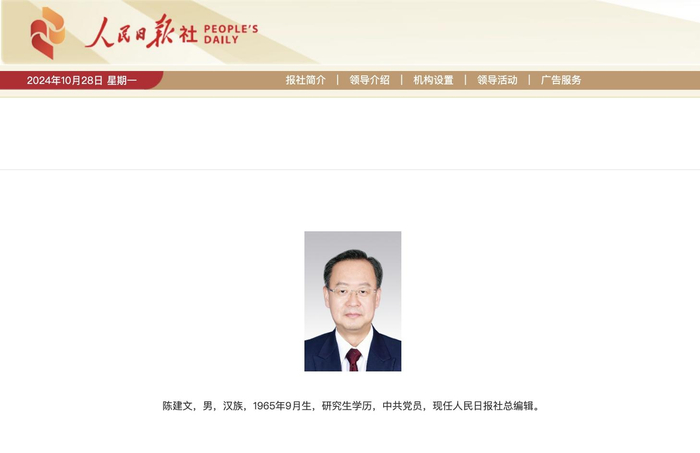 陈建文已任人民日报社总编辑 澎湃新闻 澎湃新闻官方账号 2024.10.2822:18 关注 人民日报社官网“领导介绍”栏目信息更新显示,陈建文已任人民日报社总编辑。陈建文,男,汉族,1965年9月生,研究生学历,中共党员。