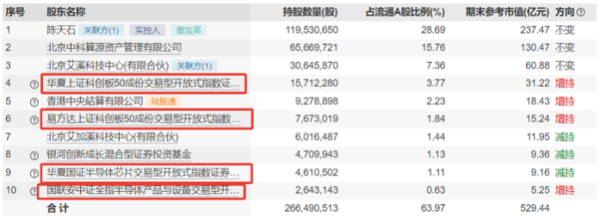 是哪路资金在支撑寒武纪的股价?Wind数据显示,寒武纪的前十大股东结构中,超过50%是基金投资者(5名),且其中绝大多数是ETF基金(交易型开放式指数基金)。