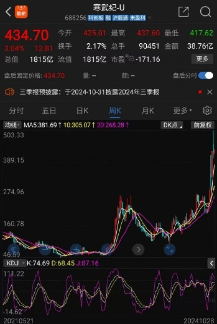 自2022年4月29日触及46.59元低点以来,寒武纪股价在约两年半时间内暴涨近十倍(较2024年10月21日股价最高点)。