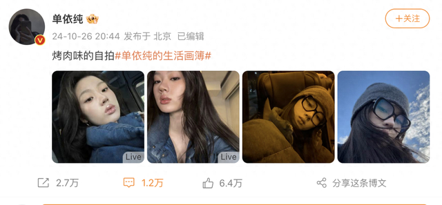 因单依纯此前说过:最近吃巧克力饼干吃胖了,单依纯昨晚微博晒照“烤肉味自拍”后,有位粉丝调侃:“烤肉也是巧克力味的吗“