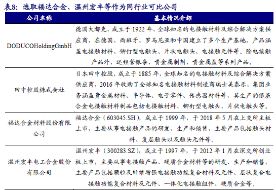 选取福达合金、温州宏丰、金昌蓝宇、斯瑞新材作为同行业可比公司。福达合金、温州宏丰、斯瑞新材和金昌蓝宇均为电接触产品生产企业,其中,福达合金、温州宏丰主要经营银基电接触产品,斯瑞新材和金昌蓝宇主要经营铜基电接触产品。福达合金、温州宏丰与发行人的产品均属于低压电接触产品,斯瑞新材和金昌蓝宇的产品则属于高压电接触产品,虽然两种产品均隶属于电工合金行业,但细分产品类型存在差异。