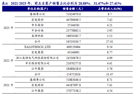 主要客户:公司主要产品广泛应用于家用电器、工业控制、汽车、智能电表、充电桩、储能设备、楼宇建筑、电动工具、配电系统等行业领域。公司的客户主要为上述低压电器产品生产企业。2021-2023年,聚星科技向前五名客户销售金额分别为17215.15万元、15475.20万元、16510.10万元,销售占比分别为28.88%、31.47%和27.41%,不存在向单个客户的销售金额占比超过50%的情况或严重依赖少数客户的情形。