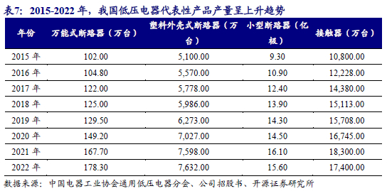 低压电器作为国民经济发展的基础产品,受益于我国经济的持续发展,行业发展情况良好。电接触产品作为低压电器的关键组成部件,受益于低压电器产品良好的发展态势,其未来的市场前景广阔。2015-2022年,我国低压电器代表性产品万能式断路器、塑料外壳式断路器(含漏电)、小型断路器(含漏电)和接触器的产量呈上升趋势。