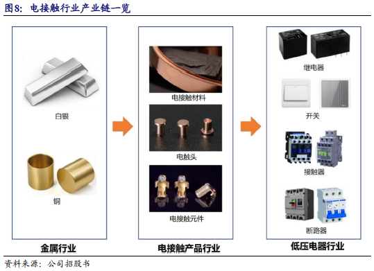 公司所处行业为电接触产品行业,上游行业为金属行业,下游行业为低压电器行业。公司上游涉及金属品种为白银和铜,公司的电接触产品主要用于生产低压电器,广泛应用于家用电器、工业控制、汽车、智能电表、配电系统等行业领域。