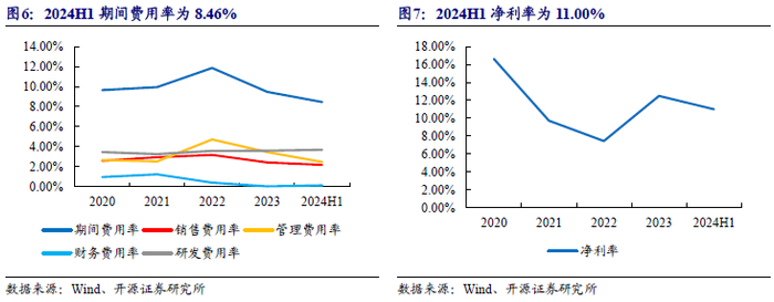 期间费用呈下降趋势,成本控制能力较强。2020-2024H1,期间费用率分别为9.65%、9.94%、11.86%、9.47%、8.46%。