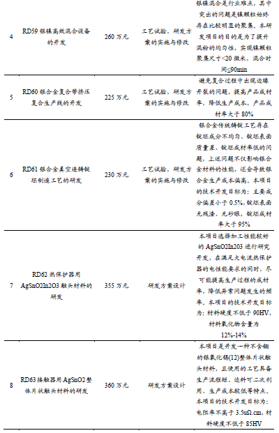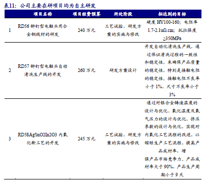 为了增强市场竞争力,公司积极展开核心技术的研发储备,公司主要在研项目均为自主研发。研发方向主要体现为根据下游客户低压电器产品适用的温度环境、电压电流水平和电寿命要求等因素,通过材料成分设计、工艺设计最终开发出符合客户需求的电接触材料。
