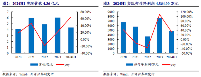 1.2、 财务:2024H1实现营收4.36亿元,归母净利润4,864.00万元