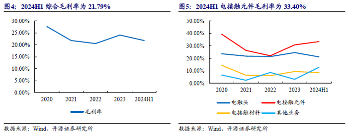 2023年和2024H1公司综合毛利率分别为24.08%和21.79%。毛利率存在一定波动性。2023年度,电触头毛利率较2022年度上升3.21个百分点,电接触元件毛利率较2022年度上升8.71个百分点。