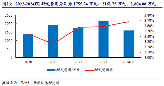 公司仍在持续加大研发投入,研发费用整体呈现增长态势。2022-2024H1研发费用分别为1755.74万元、2161.75万元、1,604.06万元,研发费用率分别为3.57%、3.59%、3.68%,整体呈现增长态势。