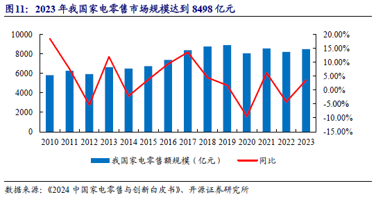 电接触产品是电气设备必备的基础元器件,近年来,随着我国电气化程度逐步加深,对电接触产品的需求量也逐年增大。根据中国电器工业协会电工合金分会的统计数据,2023年我国电接触产品行业工业总产值达到195.6亿元人民币,2015-2023年期间年复合增长率为10.98%。电接触产品下游主要应用领域低压电器是家用电器产品的核心部件之一。2023年我国家电零售市场规模达到8498亿元,恢复至疫情前(2019年)零售规模的95.4%,同比增长3.6个百分点。