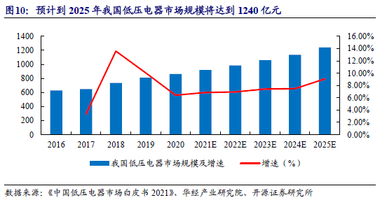 据统计,我国低压电器市场规模从2016年627亿元增长至2020年862亿元,2016-2020年CAGR为8.3%,预计到2025年我国低压电器市场规模将达到1240亿元,2020-2025年CAGR为7.54%。