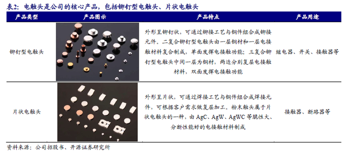 电触头主要是由电接触材料制成的一组导电元件(工作时一般需要两只触头配合),发挥电接触功能,它们彼此接触时能建立电路的连续性,彼此分离时可以断开电路,是影响低压电器寿命的关键部件,由于其体积微小却能够直接影响电路通断效果,在电路系统中发挥了重要作用,因而被称为电器的“心脏”。当电触头完全由同一种电接触材料制成时,被称为整体型电触头;当电触头由不同类型的电接触材料复合制成时(一般为银合金材料与铜复合),被称为复合型电触头,根据复合层数不同主要分为二复合电触头、三复合电触头,复合型电触头能够起到节约贵金属材料的作用。电触头是公司的核心产品,包括铆钉型电触头、片状电触头。