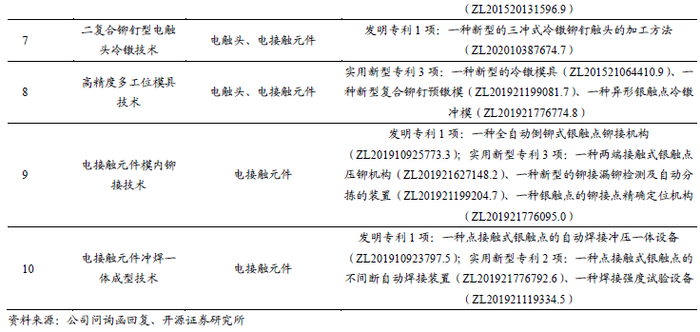 以电触头为核心,公司打造了“电接触材料—电触头—电接触元件”的完整技术链条,为客户提供一体化的电接触产品解决方案,着力提升服务精细化水平及客户附加值。围绕自主研发的粉体高效混合技术、三复合铆钉型电触头冷镦技术、电接触元件模内铆接技术等10项核心技术,公司不断夯实技术实力,构筑了独特的技术优势。