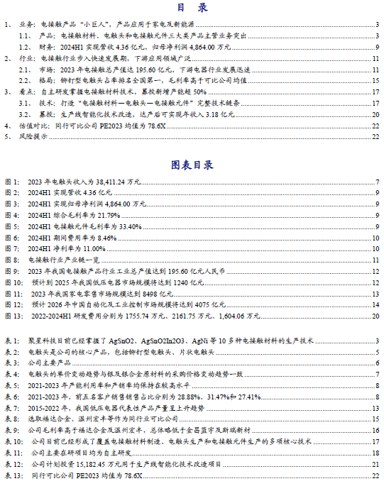 聚星科技同行可比公司PE2023均值为78.6X。聚星科技是国家高新技术企业、国家级专精特新“小巨人”企业,专注于为电接触产品的研发、生产和销售,主要产品为电触头和电接触元件,产品主要用于生产继电器、开关、接触器和断路器等各类低压电器,广泛应用于家用电器、工业控制、汽车、智能电表、充电桩、储能设备、楼宇建筑、电动工具、配电系统等行业领域,铆钉型电触头的国内市场占有率连续三年均排名第一。另外招股书预计2024年1-9月营业收入约6.6亿至7.3亿,同比增长57.36%至74.05%。归母净利润约为8300万元至9200万元,同比增长50.09%至66.36%。综上,考虑到公司技术及品牌优势,有望进一步提高行业渗透率,建议申购。