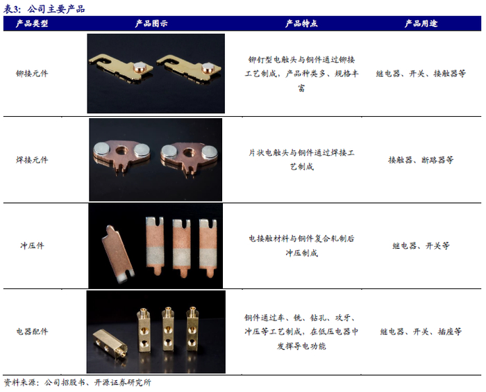 公司主营业务为电接触产品的研发、生产和销售,电接触产品具体包括电接触材料、电触头和电接触元件。电接触产品在低压电器中主要发挥接通、断开电路的作用,继而实现电器控制和电路控制,是控制低压电器通断的核心部件。