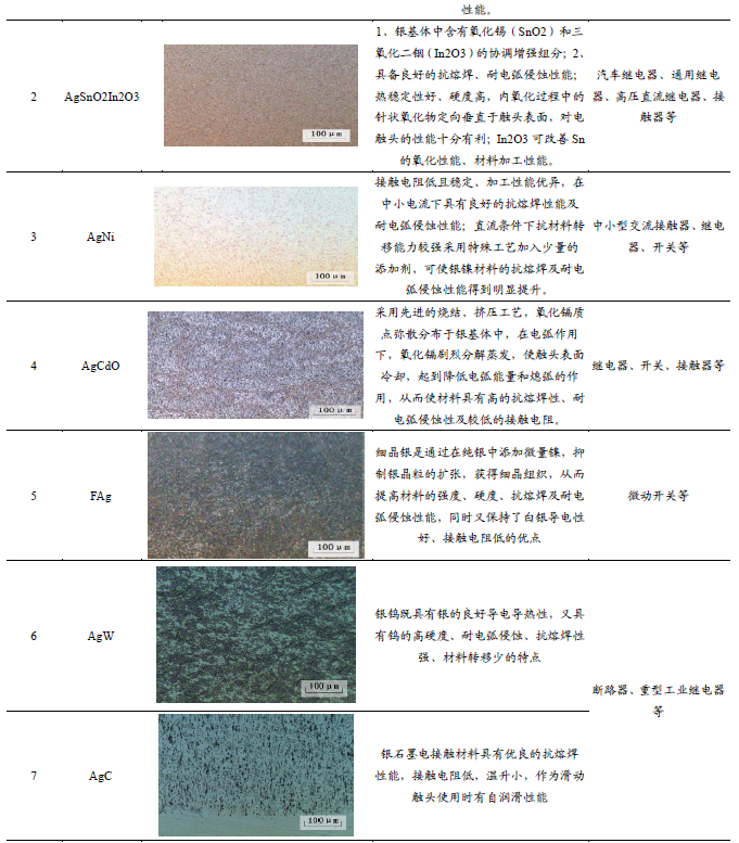 电接触材料是电触头的工作层材料,用于生产电触头及电接触元件。低压电触头大多数在空气环境中工作,银由于具有良好的导电性能并且在空气中不易被氧化,成为低压电触头中使用最广泛的原材料。纯银电接触材料导电性能优异,但硬度低、熔点低,在电弧侵蚀下容易发生飞溅、熔焊等故障。为了提升电接触材料性能,可以通过添加SnO2、In2O3、ZnO等氧化物或者Ni、W、C、WC等高熔点组分来提高电接触材料的抗熔焊、耐电弧侵蚀能力。