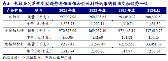 单价&销量端:2021-2023年公司电触头销售单价分别为1,353.73元/千克、1,202.14元/千克和1,310.74元/千克,电接触元件单价分别为155.06元/千克、152.60元/千克和151.68元/千克。