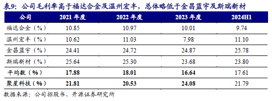 2021-2023年公司综合毛利率分别为21.81%、20.53%和24.08%。相较于同行业可比公司,公司毛利率高于福达合金及温州宏丰,总体略低于金昌蓝宇及斯瑞新材。公司综合毛利率与同行业可比公司存在一定差异,主要原因为产品应用领域、细分产品类型以及客户集中度等存在差异所致。