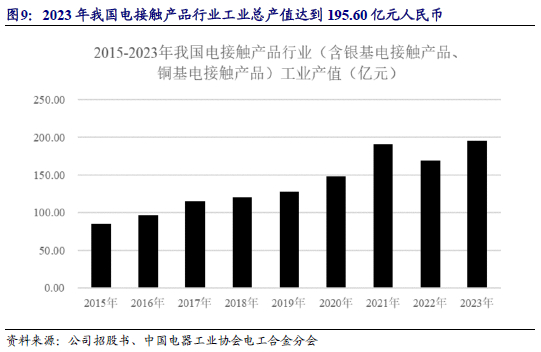 2.1、 市场:2023年电接触总产值达195.60亿元,下游电器行业发展迅速