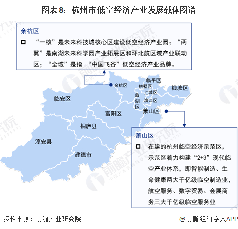 目前杭州市积极推进低空经济产业载体,杭州市加大产业园培育建设力度,引导既有相关产业园向低空经济领域拓展延伸。支持萧山区、余杭区、临平区、钱塘区和建德市等地,聚焦低空物流、低空数据、低空视觉、低空制造等领域,打造5个低空经济产业发展示范区。目前萧山区、余杭区的民用航空制造和服务配套相对完善,余杭区在低空经济产业发展已做好“一核两翼全域”的规划,而萧山区为临空制造业启动了杭州临空经济示范区的项目建设。