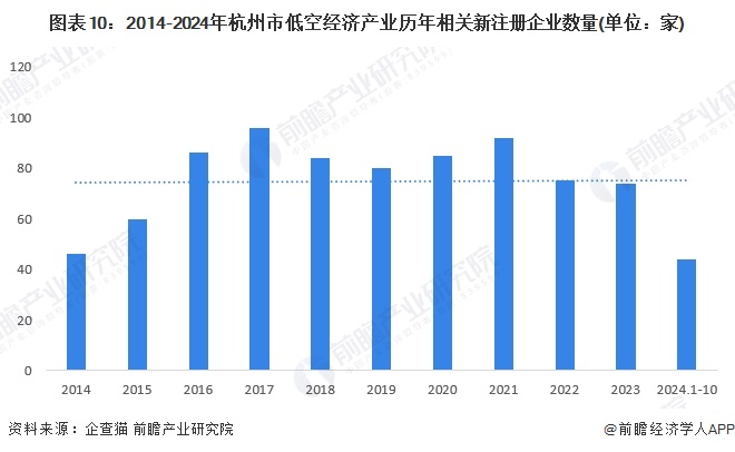 根据企查猫查询数据显示,近年来低空经济产业历年新注册企业数量也快速增长。截至2024年9月,杭州低空经济产业相关的注册企业超1100家,其中中游企业有400家,涵盖了低空航空器零部件制造、飞行保障、运行服务等领域。新注册企业数量最高的年份是2017年,为97家;2023年全年,杭州市新增低空产业相关企业数量74家。