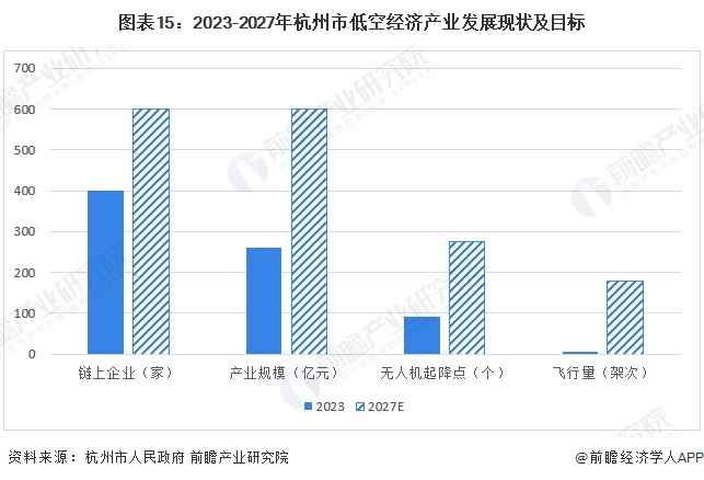 2023年开始,杭州市分别出台了政策,鼓励无人机在环境感知、气象治理、物流运输、国土规划等领域进行应用,用政策鼓励的方式拓展了无人机的应用场景。2024年杭州市出台了《杭州市低空经济高质量发展实施方案(2024—2027年)》,明确规定了要发展低空经济产业,目标是产值600亿元。政策的出台提振了低空经济产业的发展信心。