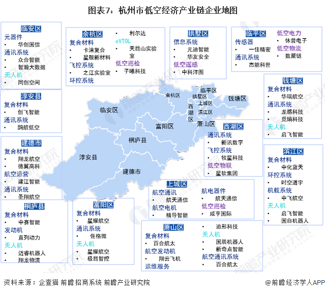 从产业链各环节的代表性企业分布地图来看,中游无人机制造主要分布在临安、桐庐、萧山、钱塘和滨江区,杭州做民用航空复合材料、金属材料的企业较少,相关涉及的区域有淳安县、富阳区、桐庐县、萧山区。大部分地区做通讯系统、飞控系统以及航空零部件。此外杭州下游低空经济解决方案提供商较多,例如余杭区低空巡检领域的子曦科技,拱墅区低空遥感相关的中科沣图,西湖区低空物联相关的星软集团,上城区低空给巡检相关的咸亨国际,临平区低空物流相关的数聚链。