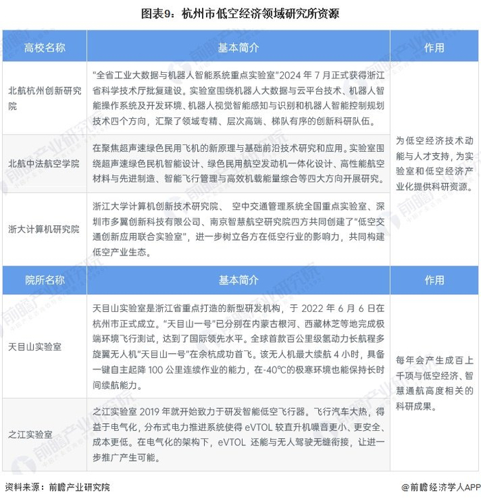 杭州拥有强劲的科研实力,在技术密集型、多学科交叉的创新赛道,目前,杭州已聚集北航杭州创新研究院、北航中法航空学院、浙大计算机研究院等一批高等院校,为杭州的低空经济产业发展提供技术动能与人才支持;专研航空技术的天目山实验室,每年会产生成百上千项与低空经济、智慧通航高度相关的科研成果。