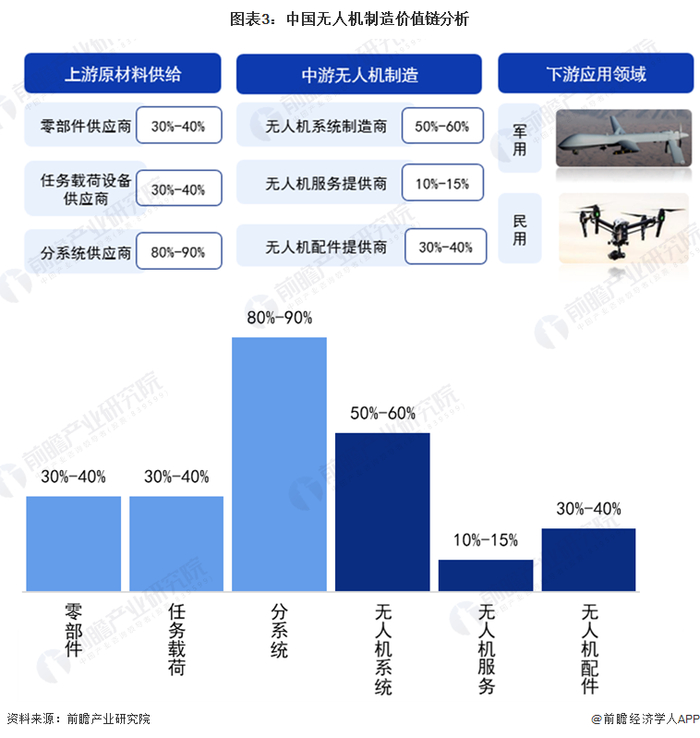 根据无人机各产业链环节的毛利率情况可知,上游无人机分系统供应商的毛利率较高,大多在80%-90%之间;中游环节,无人机系统制造商的毛利率较高,基本在50%-60%之间,行业盈利能力较强;无人机服务提供商的毛利率较低,在13%左右。