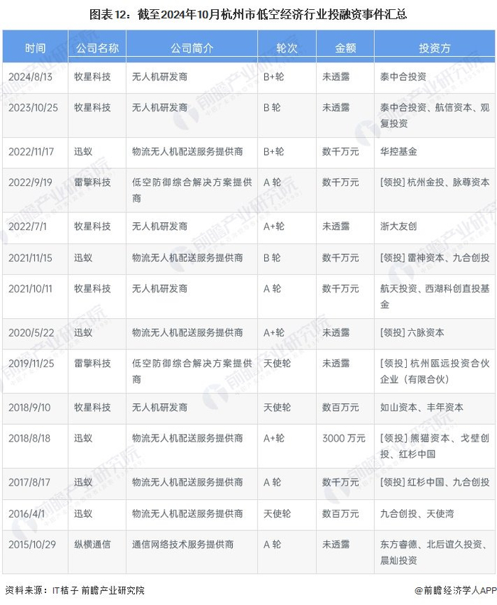 2024年以来杭州市低空经济行业投融资事件汇总如下: