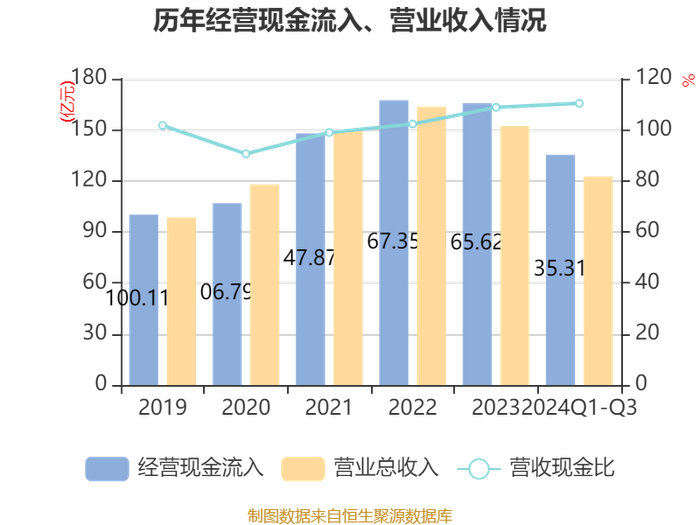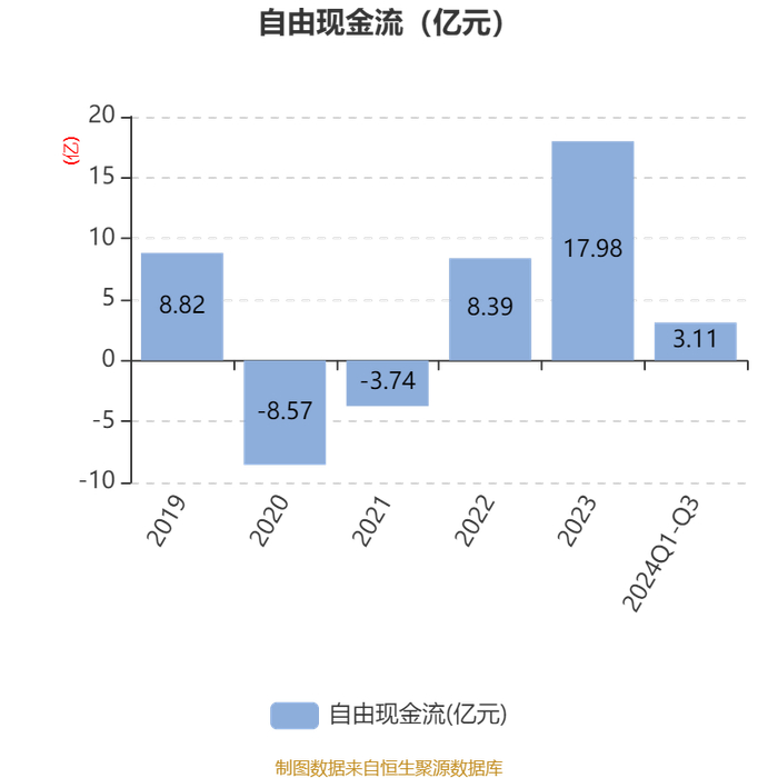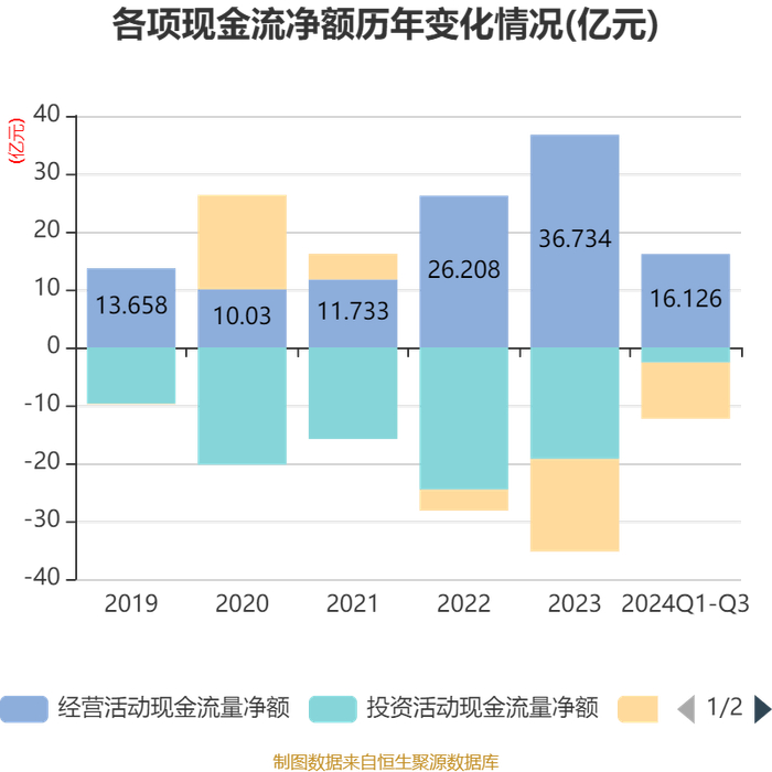 2024年前三季度,公司经营活动现金流净额为16.13亿元,同比下降37.47%;筹资活动现金流净额-9.7亿元,同比增加4.45亿元;投资活动现金流净额-2.61亿元,上年同期为-13.39亿元。