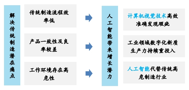 人工智能通过数据分析、自动化和预测性维护有效地解决了传统制造行业的诸多痛点。人工可以实时监控生产过程,优化资源配置,提升生产效率,减少设备故障和停机时间。此外,人工智能还能够通过分析大量数据,预测市场需求和产品质量,进而帮助企业实现更精准的生产计划和质量控制,降低成本,提升竞争力。