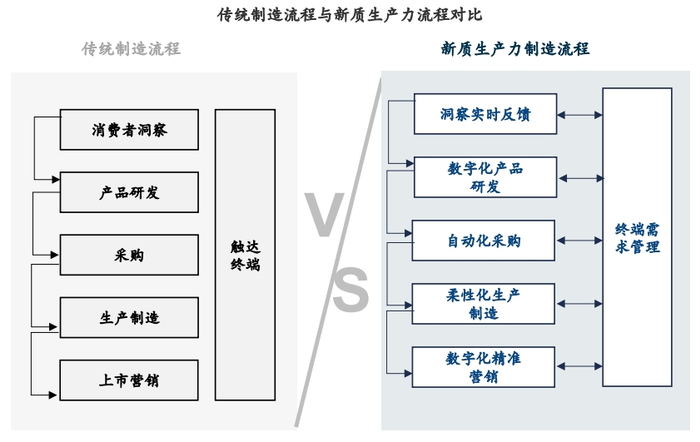 1)与传统制造流程相比,新质生产力制造流程的各环节均引入了不同的数字技术,同时可赋予制造业体系多组织协同,并在各环节可直接触达或管理终端需求。而传统制造流程仅在产品上市后进行终端触达。