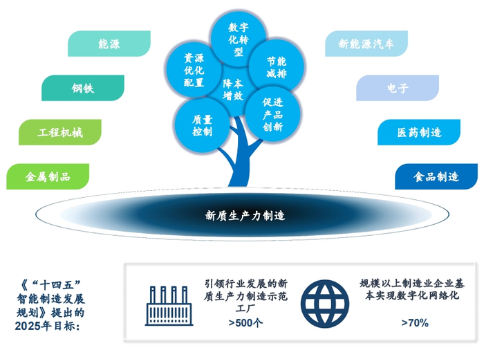 新质生产力制造是指通过物联网、大数据、云计算、人工智能等数字化技术使制造流程具备信息自动感知、自动决策、自动执行的新型生产模式或系统,数字化技术与新一代信息技术可赋能制造过程的各环节,其核心在于新质生产化关键制造环节、智能工厂、端到端数据流等。
