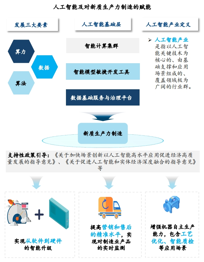 人工智能赋能新质生产力制造发展已成为主流趋势,下游应用场景丰富。基于软件服务、云服务、硬件基础设施等产品形式,结合消费、制造业、互联网、金融、元宇宙与数字孪生等各类应用场景,人工智能赋能各个产业发展。