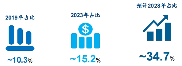 随着数字化转型进程的深入,云计算已逐渐发展成为国民经济增长的重要驱动力,并上升为国家重要战略目标。我国云计算市场于2028预计将达到约人民币2.9万亿元,占全球市场比重将从2023年的15.2%上涨至2027年的34.7%。