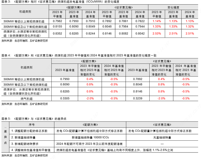 相比于《征求意见稿》,《配额方案》给出的不同类型燃煤机组发电基准值均有不同程度地上升,涨幅在1.1%-2.6%之间(详见表3)。但是,两个文件中,不同类型的燃煤机组2023年平衡值和2024年基准值相对2023年基准值的变化幅度一致(详见表4)。并且对于燃煤机组的供热基准值,燃气机组的发电基准值和供热基准值均保持一致。
