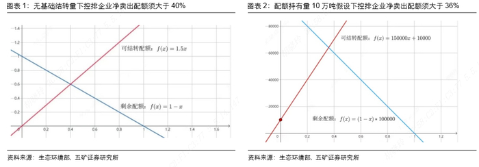假设控排企业持有的配额量为Y,根据《征求意见稿》,当Y<10000tCO2时,控排企业想申请配额结转,需净卖出配额(即有条件获得结转配额),假设净卖出配额比例为x,则剩余配额为(1-x)Y,控排企业获得的最大配额结转量为1.5xY,意味着企业需要至少卖出40%的持有配额,才可将剩余配额结转,否则,剩余配额不能完全结转。