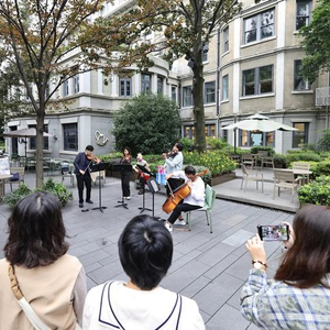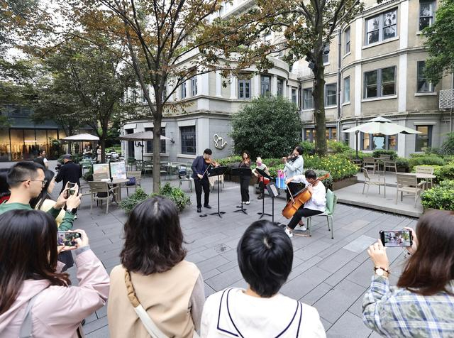 当天下午,一支弦乐四重奏提前走进衡复音乐街区,在见证上海百年繁荣演变的黑石公寓面前,来了一次音乐快闪。