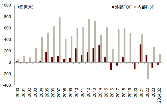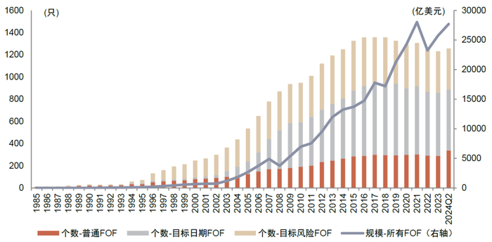 • 成熟期(2014年至今):在经历两轮发展后,美国公募FOF产品市场逐渐进入稳态。产品数量达到动态平衡不再呈现增长趋势,每年新成立基金与清盘或合并基金的数量较为相当,整体市场产品数量大致维持在1250~1300只的范围。产品规模虽然仍在上升,但FOF产品相对全部非货币公募基金的规模占比不再保持上行趋势,开始稳定在9%上下。且上升的规模主要由存量规模资本增值带来,净流入资金额相比存量规模的占比则迅速下降到个位数,近3年资金流入占存量规模占比不足1%。因此产品规模增长速度明显降档,从2014年至2024年中,美国公募FOF规模复合年化增长率为8%,截至2024H1规模达2.77万亿美元。
