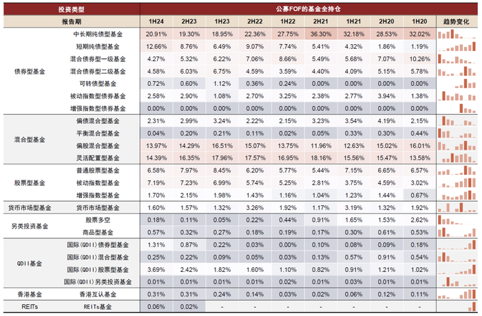 此外,相对另类的投资品类也逐渐受到部分公募FOF产品的关注。近一年,QDII股票型基金和QDII债券型基金的持仓占比呈现一定的抬升趋势,2024年中的配置比例相较2023年中分别提升1.88ppt和1.09ppt。公募REITs也于2023年首次出现在公募FOF持仓中,不过截至2024年中的持仓占比仅为0.06%。香港互认基金的持仓比例也有小幅上行,截至2024年中占比0.31%。相比之下,股票多空和商品型基金的关注度维持低位,截至2024年中持仓占比分别仅为0.18%和0.57%。
