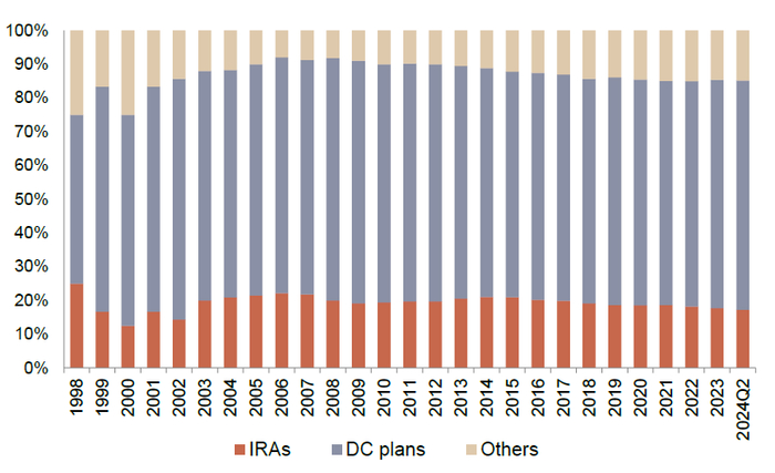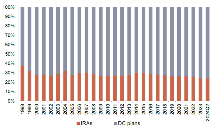 图表21:美国养老基金(目标日期&目标风险)规模在DC计划与IRAs之间的比重结构