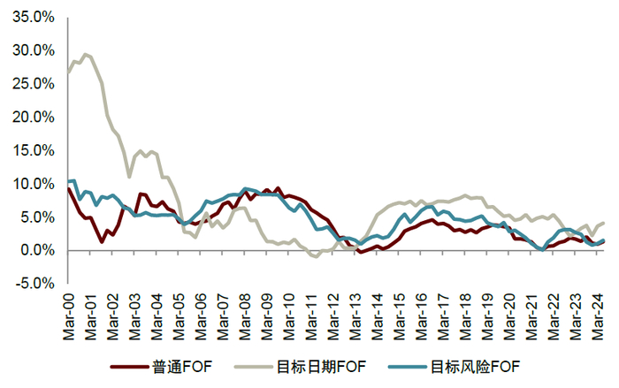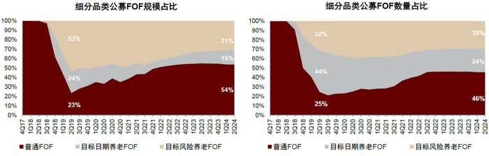 如依据投资目标,我们一般将公募FOF划分为养老FOF和普通FOF两大类,其中,养老FOF又可进一步细分为养老目标日期FOF和养老目标风险FOF。近年来,普通FOF的规模占比整体呈现先上升、后稳定的趋势,截至2024年二季度末占比超五成。目标日期养老FOF近年来有扩容趋势,规模占比升至15%,而目标风险养老FOF规模占比压缩至31%。