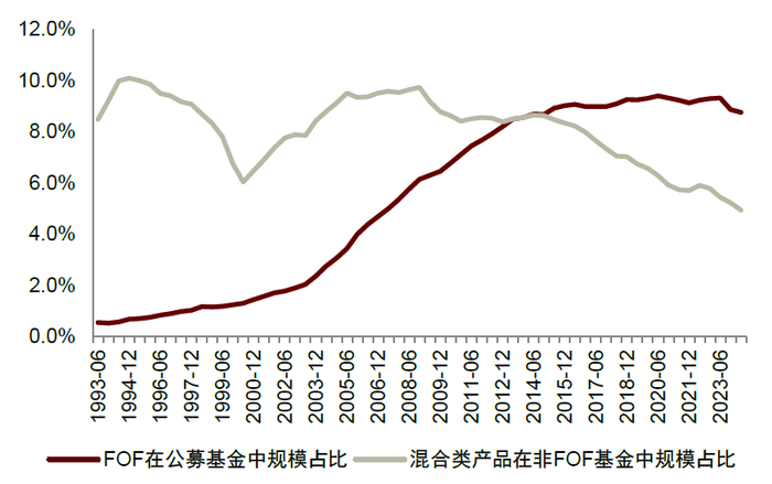 当然随着国内市场与资管行业日渐成熟,公募产品结构中非FOF混合型基金的规模占比在近两年开始显著下滑,2023年及2024年(截至6月底)两年分别以24%与20%的规模占比连续创下新低。这对于国内公募FOF未来发展无论是从底层标的区分度还是生态定位空间的角度,都将更为有利。