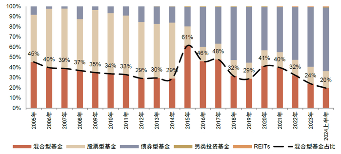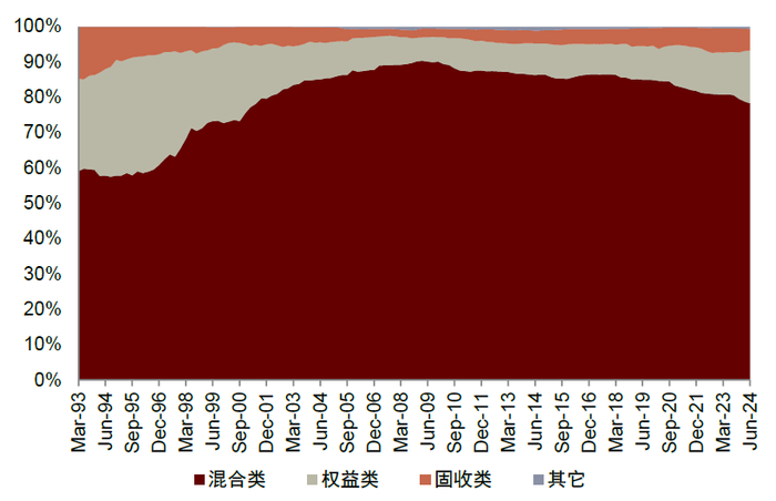 而混合型产品作为公募基金里的一个生态定位,除了FOF形式,还有直接投资多种底层资产标的的混合型基金。美国公募FOF的规模扩容能较为顺利的进行,除了前序所述的养老政策配套机制的支持,也与美国公募资管行业为其在混合型产品这个生态定位中留下足够空间不无关系。在美国公募基金生态环境中,投资者对于各类产品的定位期待更为精确细分,对于直接投资底层资产的基金产品的要求往往是专精做好单一资产内部标的的优选。因此能观察到即使把货币基金规模剔除,美国非FOF基金中混合型基金的规模占比基本也不会超过10%,近20年也依然在持续下降通道中。截至2024H1,非FOF非货币基金样本内混合型基金规模占比已降至不足5%。