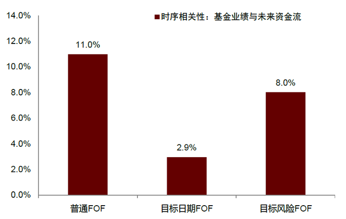 时序相关性上,普通FOF与目标风险FOF这两类产品显示出资金流入与前期业绩的较高相关性,而目标日期FOF的资金流与前期业绩时序相关系数平均值仅2.9%。表明普通FOF与目标风险FOF投资者对于其绝对收益更为敏感,往往会基于其前期收益增加或撤出资金,而目标日期FOF投资者对其产品定位更偏长期资产配置,故而对于一段时间内的绝对收益不是特别敏感。另一个目标日期FOF产品“资金-业绩”时序相关性低的原因则在于目标日期FOF有大量来自DC计划的稳定现金流,因此作为一类产品整体其资金流对前期绝对业绩的敏感性并不高。