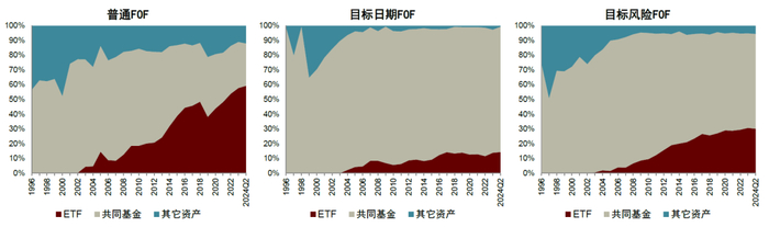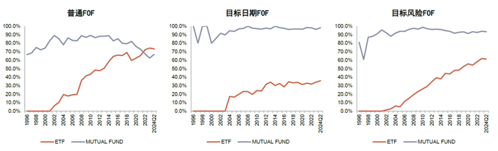 图表14:美国不同类型公募FOF持有ETF或共同基金的产品个数占比变化