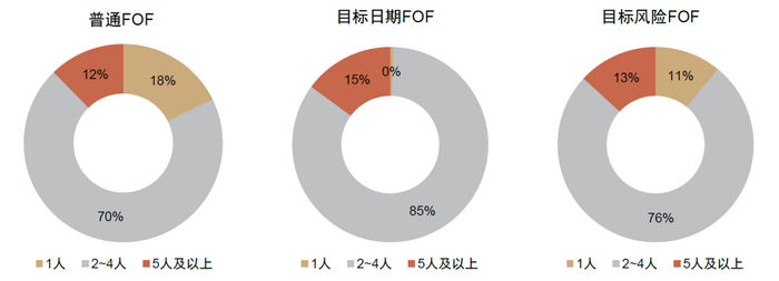 美国公募大多采用多基金经理共管制度,我国资管机构在FOF产品大多以单基金经理制为主,20%左右产品采用多人共管,且共管人数也大多都为2人共管,很少有3人及以上的共管产品。那具体哪种管理方式更适合FOF赛道?多人共管或者团队协作的优势是业务细化带来的投研边际投入回报比的上升,劣势则是人力成本与绩效归因成本的增加,因此具体产品更适合哪种管理体系正取决于这两者的权衡。