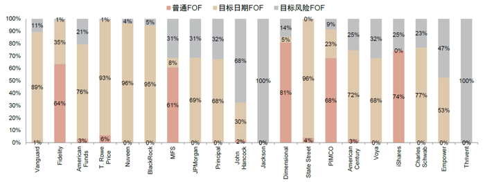 在竞争格局逐渐清晰的业态环境下,不同机构基于其进入市场的时机与自身禀赋,采用不同的布局方式。头部机构往往利用其先发优势,大力发展规模空间最为稳定的目标日期FOF,例如Vanguard、T. Rowe Price、Nuveen、BlackRock,其目标日期FOF产品规模占比基本都在90%及以上。一些在资产内部主动配置能力更强的机构可以在普通FOF上发力,例如Fidelity、MFS、Dimensional、PIMCO等,其普通FOF产品规模占比均在60%以上。也有部分如John Hancock、Jackson等采取差异化竞争,主要布局目标风险FOF产品。同时值得注意的是,基本没有头部机构采用全面均衡布局的策略。