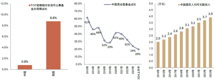 潜在空间维度:参考美国公募FOF市场,当达到成熟期时,美国公募FOF规模相对整个非货币公募市场占比维持在9%左右,而中国公募FOF规模占比较小。截至2024H1,美国公募FOF占比8.8%,中国公募FOF规模占比仅0.8%,尚有充分的规模扩容潜力。